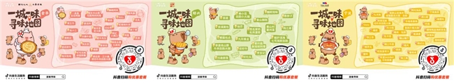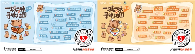 除了海报和表情包,5城还推出了有趣的“卡皮巴拉寻味地图”,以 IP 为引导,为用户提供清晰的五城寻味指引,帮助用户进一步发掘浙江5城的宝藏小店,跟着卡皮巴拉的脚步,解锁当地宝藏小店深藏的城市风味。