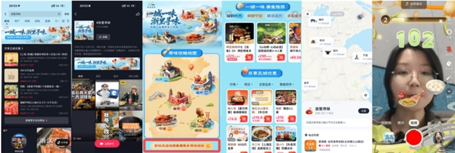其二是 “足迹地图” 功能,用户搜索 #浙里寻味即可进入地图界面,五城美食分布一目了然,地图同步关联商家团购主页,实现 “选店 – 下单” 的无缝衔接,为用户提供高效便捷的消费路径。